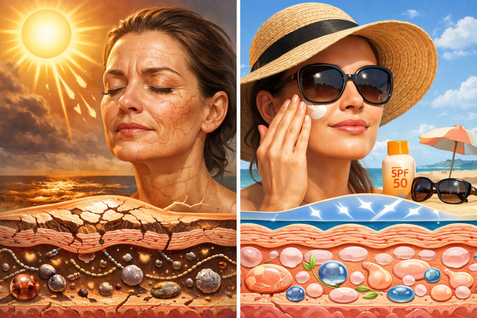 Ультрафиолет – один из главных факторов разрушения гиалуроновой кислоты в тканях. УФ-излучение запускает процессы окисления, которые повреждают клеточные оболочки и замедляют синтез собственных структурных белков кожи. Результат: потеря упругости, тусклый тон, преждевременные морщины.