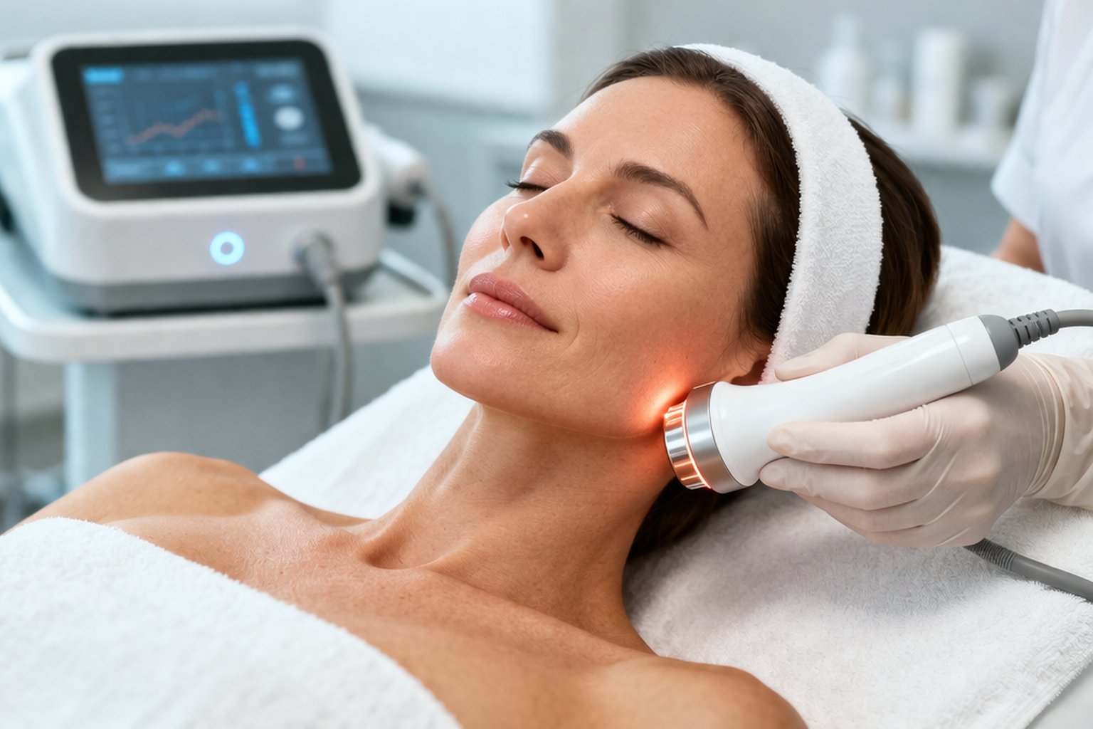 Нагрев запускает два процесса. Первый – мгновенный: старые коллагеновые волокна под действием тепла сокращаются, как сжатые пружины. Кожа буквально уплотняется прямо во время процедуры, контур лица становится чётче. Второй процесс – отсроченный и более глубокий. Клетки-фибробласты воспринимают нагрев как сигнал к действию и начинают синтезировать новые волокна коллагена и эластина. Этот процесс продолжается ещё несколько месяцев после курса – именно поэтому эффект нарастает постепенно, а не заканчивается сразу после последнего сеанса.