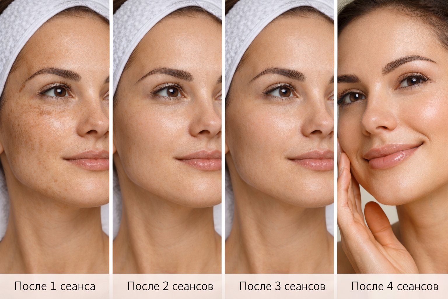 Один сеанс даст видимое улучшение тона, но не уберёт пигментацию полностью. Пилинг для осветления пятен должен проводится курсом: 4–6 процедур с интервалом 2–4 недели в зависимости от типа пилинга и состояния кожи. Первые заметные изменения большинство пациентов отмечают после 2–3 сеансов.