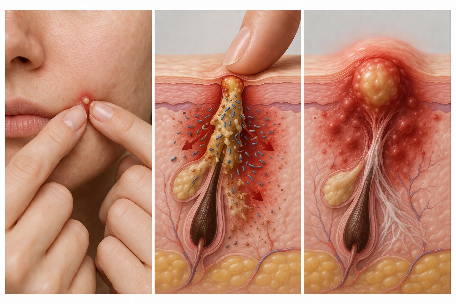 Это объясняет парадокс, знакомый многим: после домашней чистки прыщей становится больше, а не меньше. Кожа не «очищается», она получает серию микротравм, каждая из которых запускает воспалительный каскад.